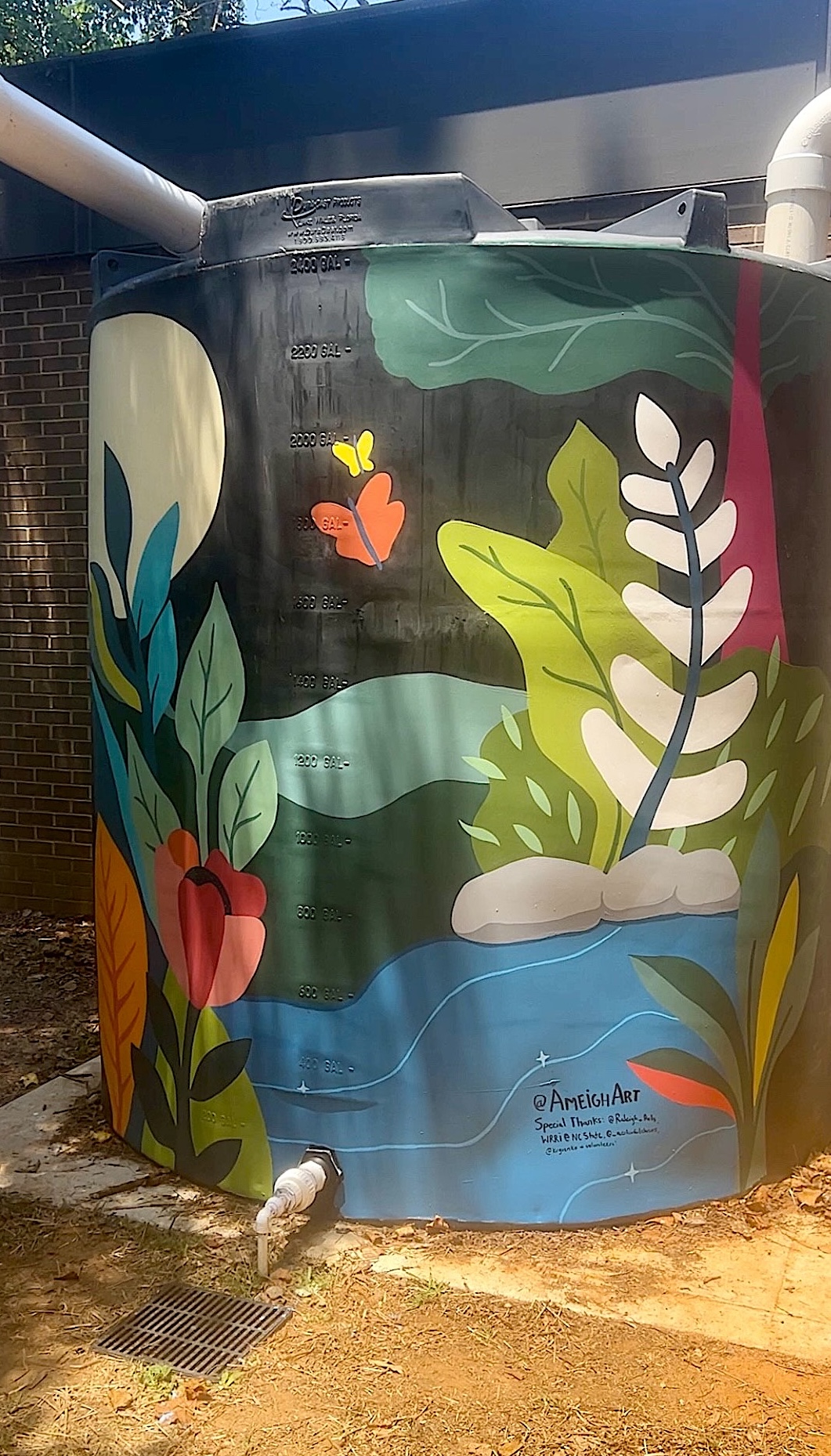 Raleigh Arts, the City’s public arts division, joined the team to help invite local artists to submit applications to design and paint murals on the rainwater harvesting cisterns. Chris Burwell, the park director, shared the submitted illustrations with park users to select a design that resonated with community members. Local artist Adriana Ameigh’s dreamy and colorful botanical murals were the community favorites and now provide vibrant images for parkgoers to enjoy while picnicking or playing on the nearby playground. In addition, informational signs about bioretention and rainwater harvesting inform visitors about the park’s green stormwater infrastructure.