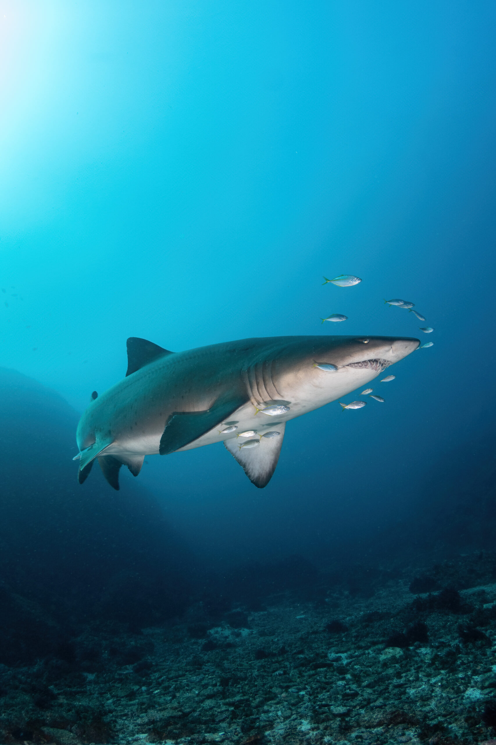 Sandbar sharks can grow to 12 feet and can be found year-round in North Carolina waters, especially around structures such as wrecks and live-bottom habitats. Developing sand tiger sharks will consume their siblings in the womb until only two remain, and at birth are more than 4 feet long. Despite their savage start and fearsome appearance, sand tiger sharks are usually docile around humans, which makes them popular with divers and aquariums. With their proportionally small fins, pointed snouts and jagged teeth, sand tiger sharks are easily identified.